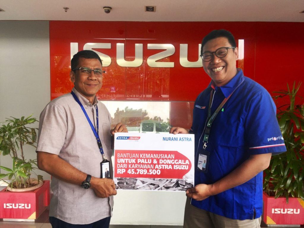 Astra Isuzu mengajak seluruh cabang untuk menyampaikan belasungkawa atas bencana alam, gempa bumi dan tsunami yang terjadi di Palu, Sigi dan Donggala yang terjadi September lalu. Penyerahan bantuan disalurkan melalui Lazis Amaliah Astra dan Nurani Astra yang diwakili oleh Imam Lazuardi selaku Ketua Ikatan Karyawan Astra Isuzu.